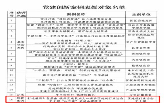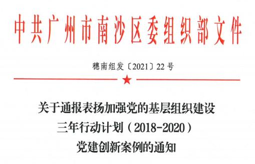 获得南沙区“加强党的基层组织建设三年行动计划(2018-2020)党建优秀创新案例”称号