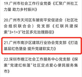 2019 年 12 月协会成立了党支部。近四来年协会党支部充分发挥了党建引领作用,先后获得广州市社会组织党建工作示范点、广州市社会组织党建示范(党员教育)基地、南沙区先进基层党组织,2021 年创建的党建品牌项目《打造基层红色堡垒 提升党建软实力》,被评为广东社会组织党建品牌优秀案例、2021 年度南沙区十大党建工作品牌等 9 项荣誉。