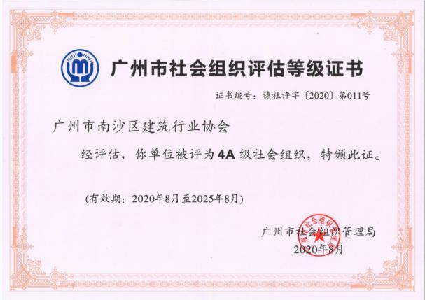 秘书处努力加强自身组织建设,按时完成历年社团年检工作,年检结论均为合格。2020 年 8 月,获评广州市4A 级社会组织荣誉,多次收到广州市南沙区建设科学服务中心、广州粤港澳大湾区社会组织合作发展中心及其他企业单位的表扬信及感谢信。