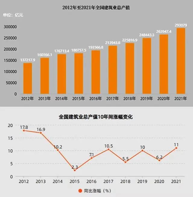 在讨论中,于会长还援引了国家统计局2022年初发布的建筑业产值数据:2021年,全国建筑业总产值293079亿元,同比增长11.0%。其中,江苏建筑业总产值以38244.49亿元的成绩继续领先于其他省份,浙江和广东2个省份建筑业总产值均超过2万亿元,跻身前三行列。